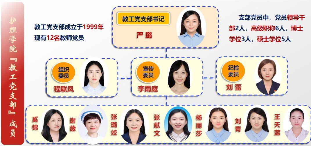 贵州中医药大学护理学院教工党支部成立于1999年,至今已有26年建设历程,现有教师党员12名,其中高级职称6人、博士3人,党员队伍政治素质高、业务能力强、结构梯队合理。支部在学院党委坚强领导下,严格落实“三会一课”、主题党日等组织生活制度,建立健全党员学习教育、管理监督、联系群众等工作机制,组织机构健全、支委分工明确、运行规范高效。