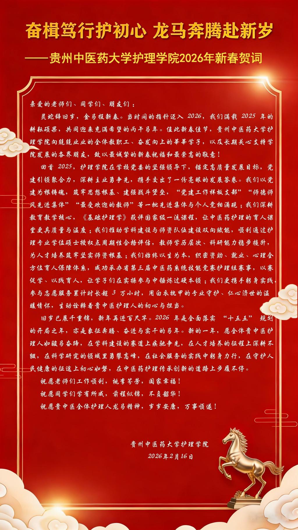 奋楫笃行护初心 龙马奔腾赴新岁--贵州中医药大学护理学院2026年新春贺词